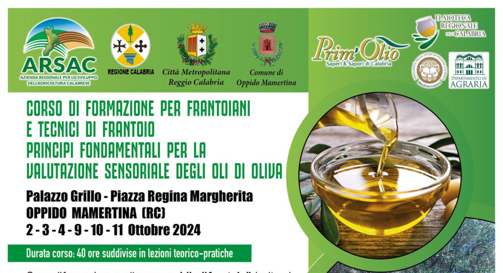 Si terrà a Oppido Mamertina, in provincia di Reggio Calabria, un nuovo corso di formazione per “frantoiani e tecnici di frantoio” rivolto ad imprenditori e tecnici del settore. Il corso, organizzato dalla Regione Calabria e dall’Azienda regionale per lo sviluppo dell’agricoltura (Arsac), è in programma dal 2 all’11 ottobre prossimi presso Palazzo Grillo e si pone l’obiettivo di offrire un percorso professionalizzante mirato ad accrescere le competenze nella gestione del frantoio per la produzione di un olio extravergine di oliva di qualità.